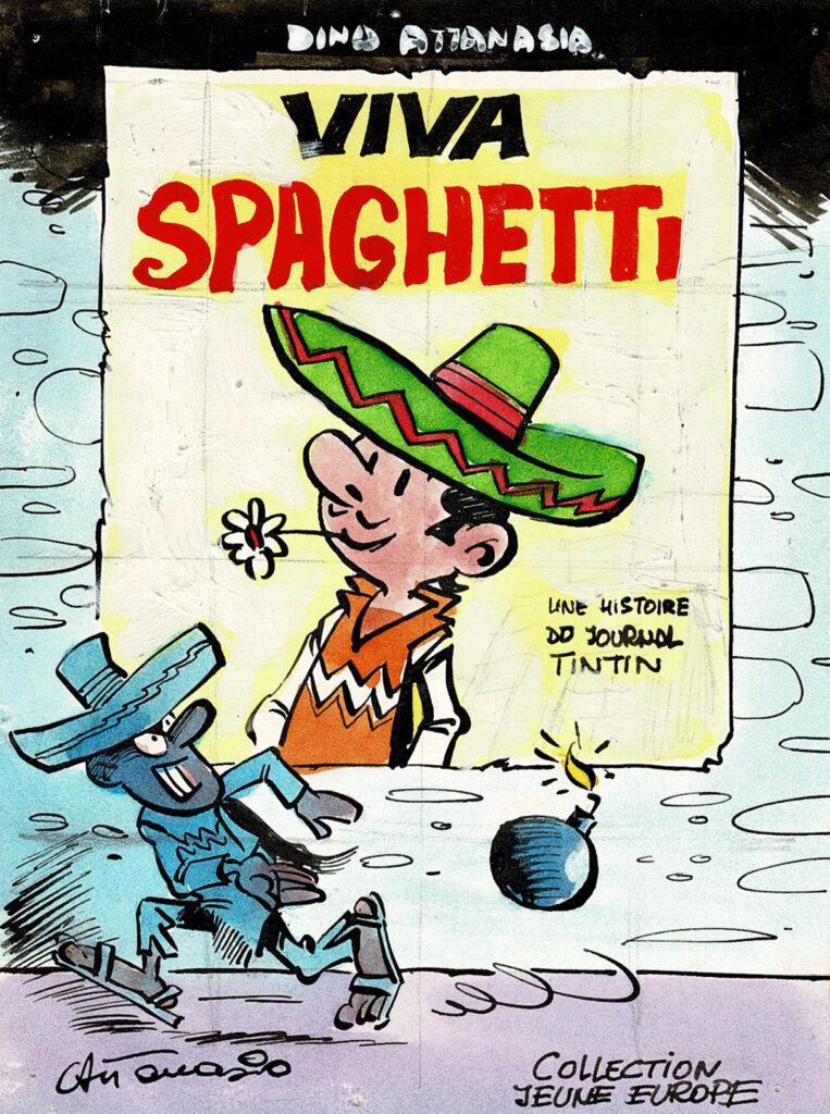 Spaghetti, Via Spaghetti, projet de couverture original à l’encre de chine et à l’aquarelle. Dimensions : 14 cm x 10,5 cm.