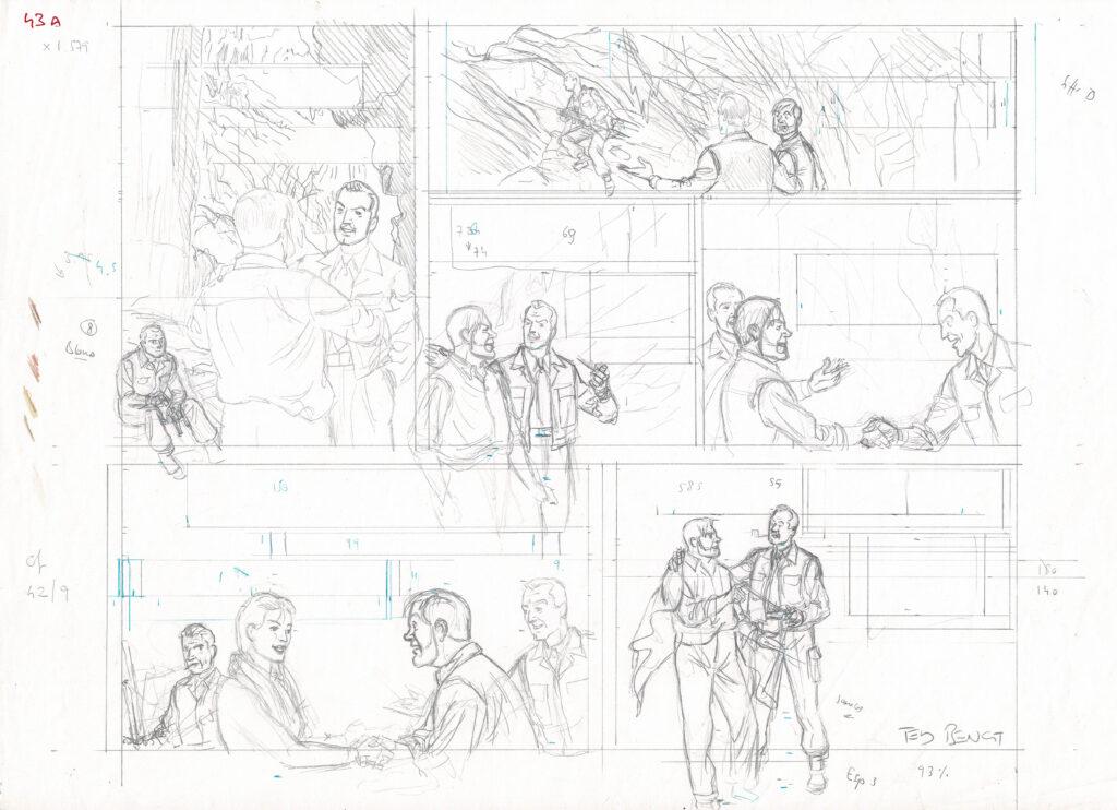 Blake et Mortimer, L’étrange rendez-vous, demi planche originale préparatoire à la mine de plomb pour cet album paru en 1996 chez Blake et Mortimer. Dimensions : 41 cm x 29,5 cm.