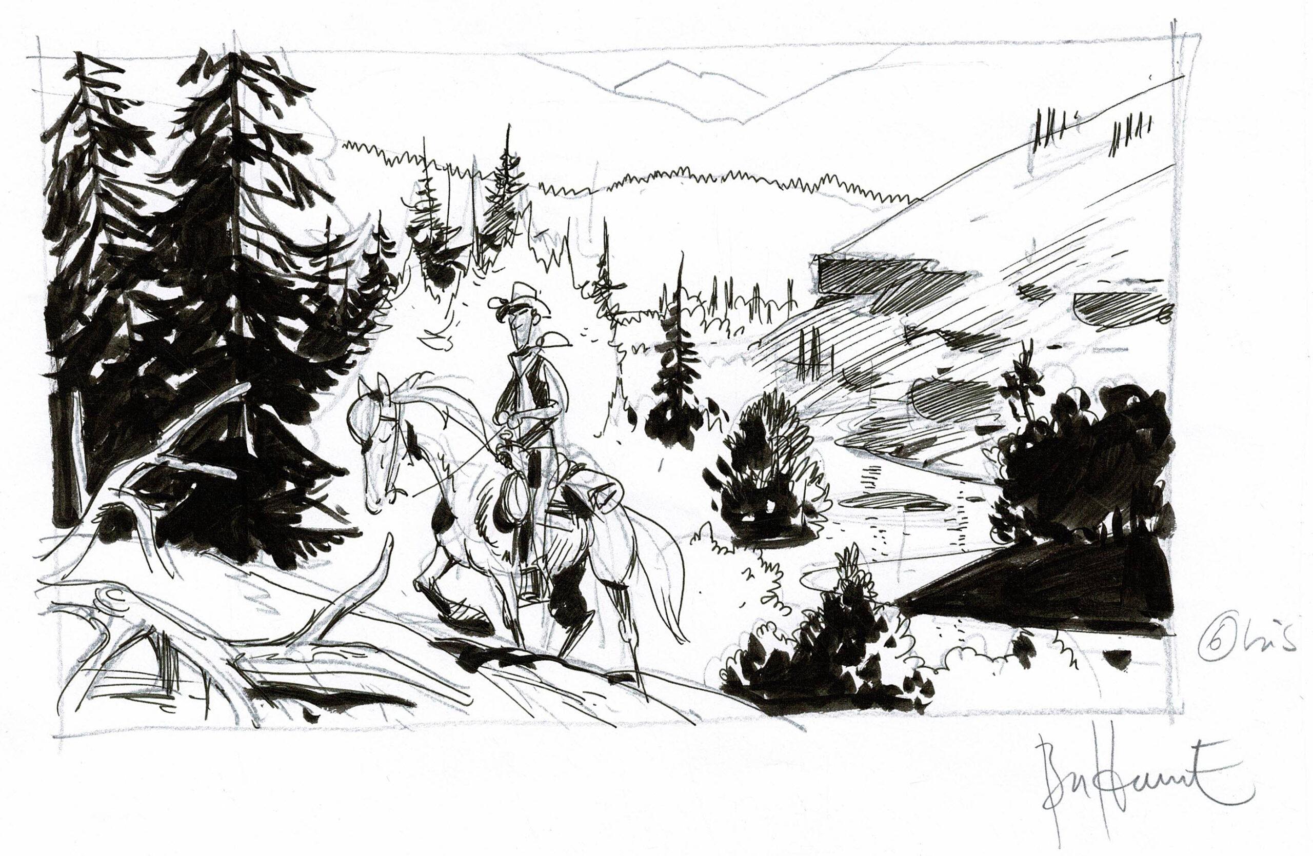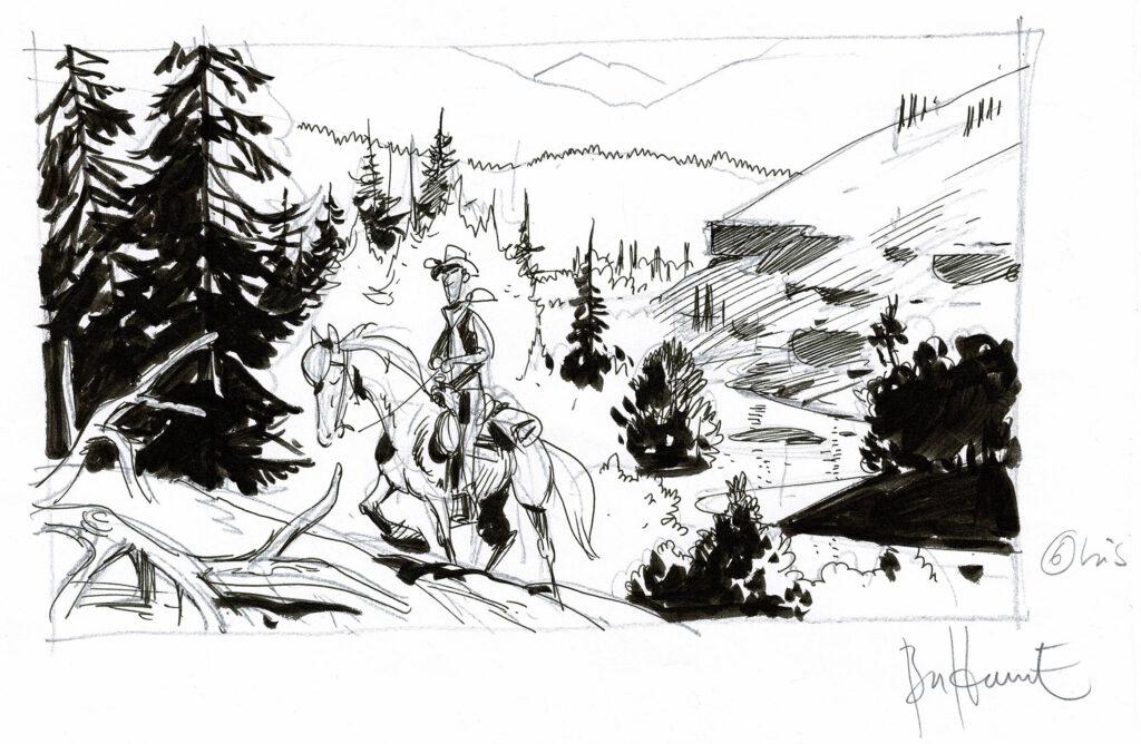 Lucky Luke, projet de couverture original à l’encre de chine et à la mine de plomb. Dimensions : 24 cm x 18 cm.