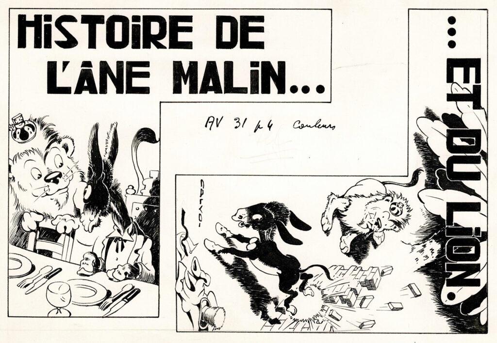Histoire de l’âne malin … et du lion, dessin original à l’encre de chine publié dans Ames vaillantes en 1952. Dimensions : 20 cm x 14,5 cm.