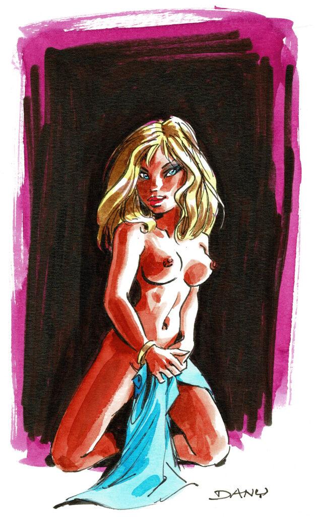 Pin-Up, dessin original à l’encre de chine et à l’aquarelle. Dimensions : 28 cm x 21 cm.