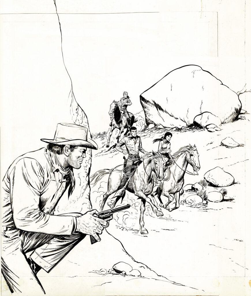 Bob Morane, La Vallée des Crotales, couverture originale très grand format pour cet album paru en 1964 chez Marabout. Dimensions : 62 cm x 50 cm.