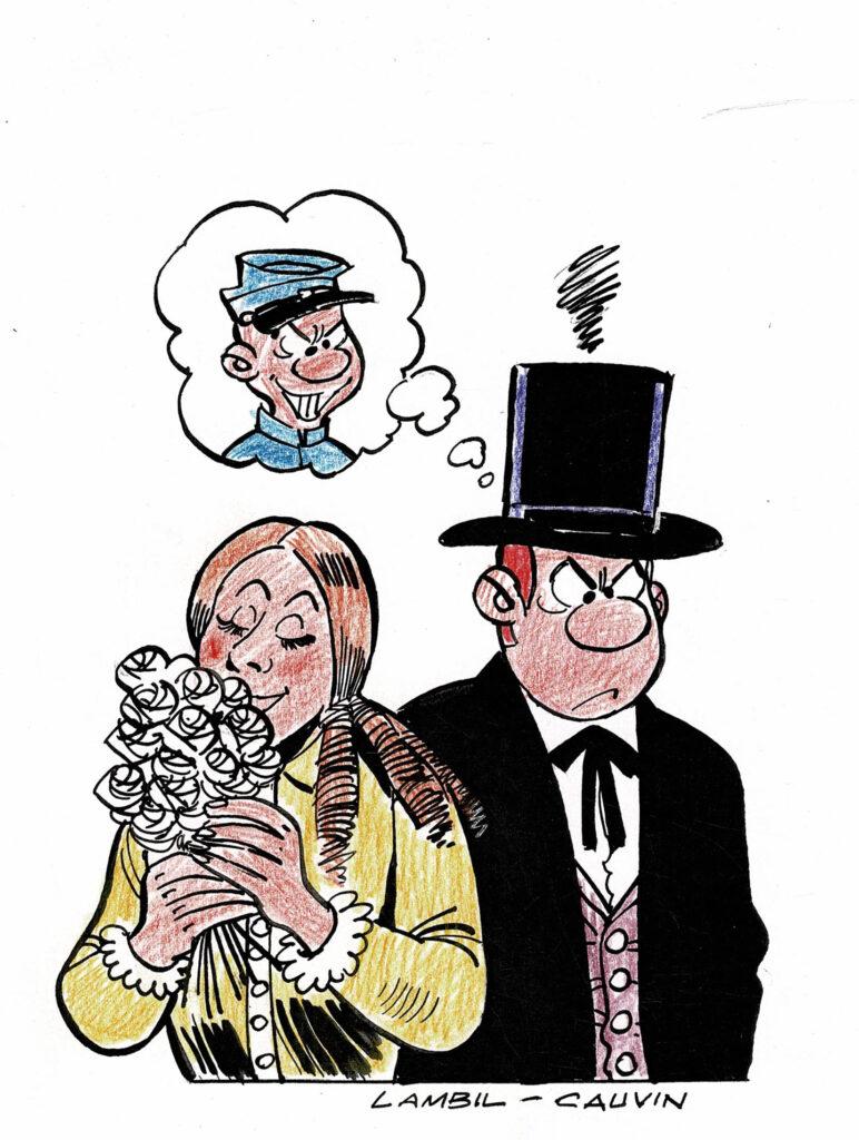 Les Tuniques Bleues, dessin original à l’encre de chine réalisé pour un ex-libris. On joint la mise en couleurs et la publication. Dimensions : 19,5 cm x 18,5 cm.