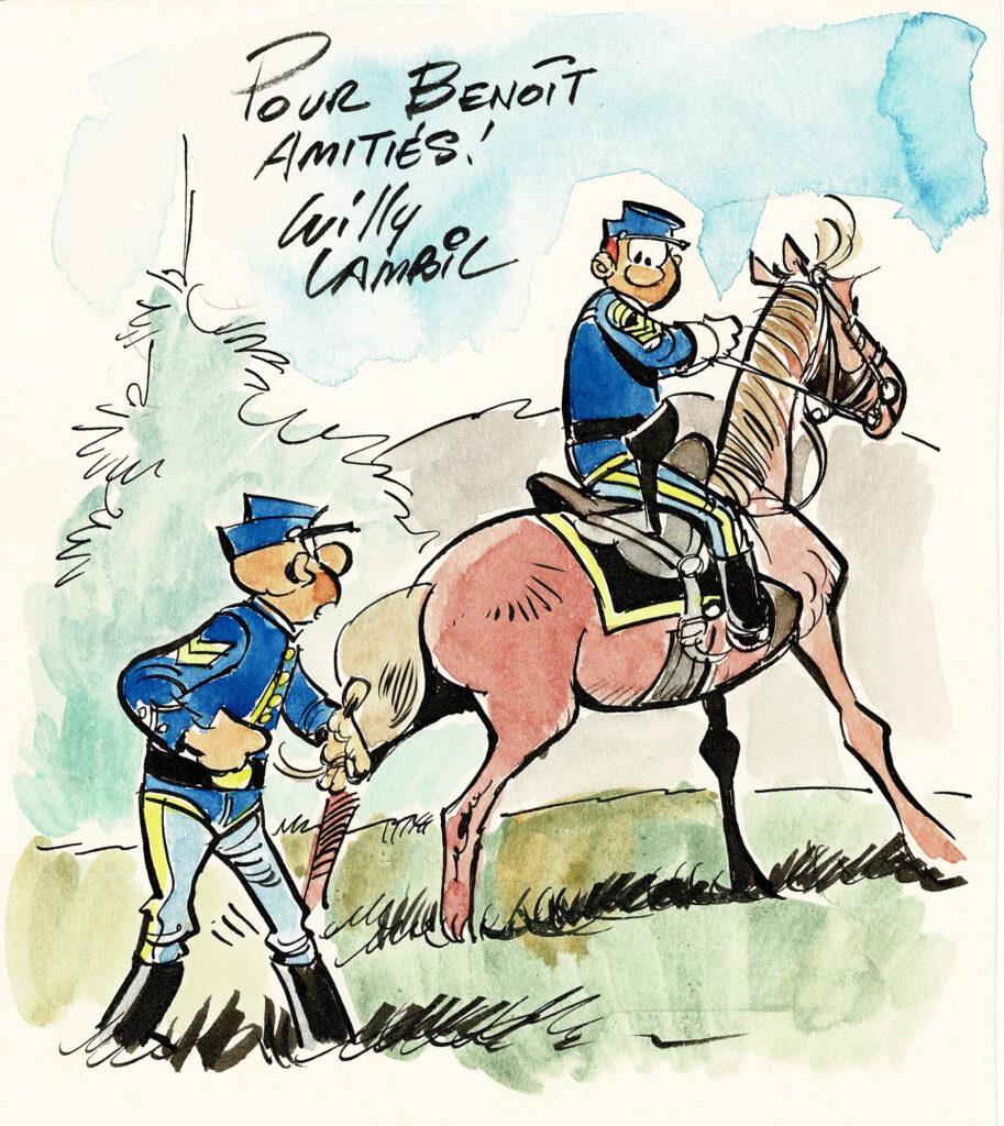 Les Tuniques Bleues, dessin original à l’encre de chine et à l’aquarelle. Dimensions : 18 cm x 16 cm.