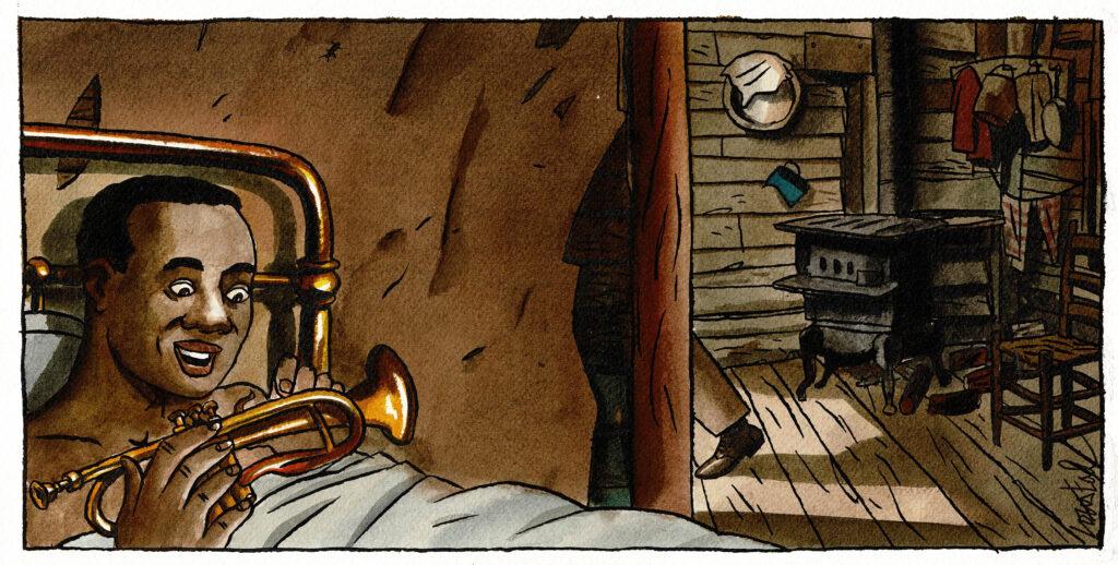 Le Roi du Jazz, dessin original à l’encre de chine et aux encres de couleurs. Dimensions : 32 cm x 16 cm.