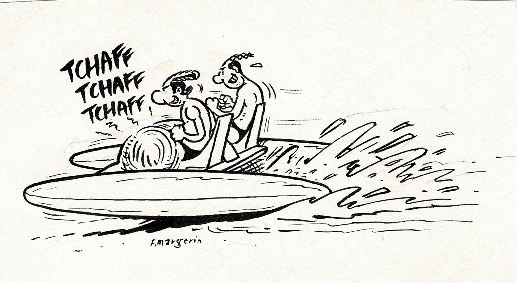 Lucien en pédalo, dessin original à l’encre de chine. Dimensions : 15,5 cm x 8,5 cm.