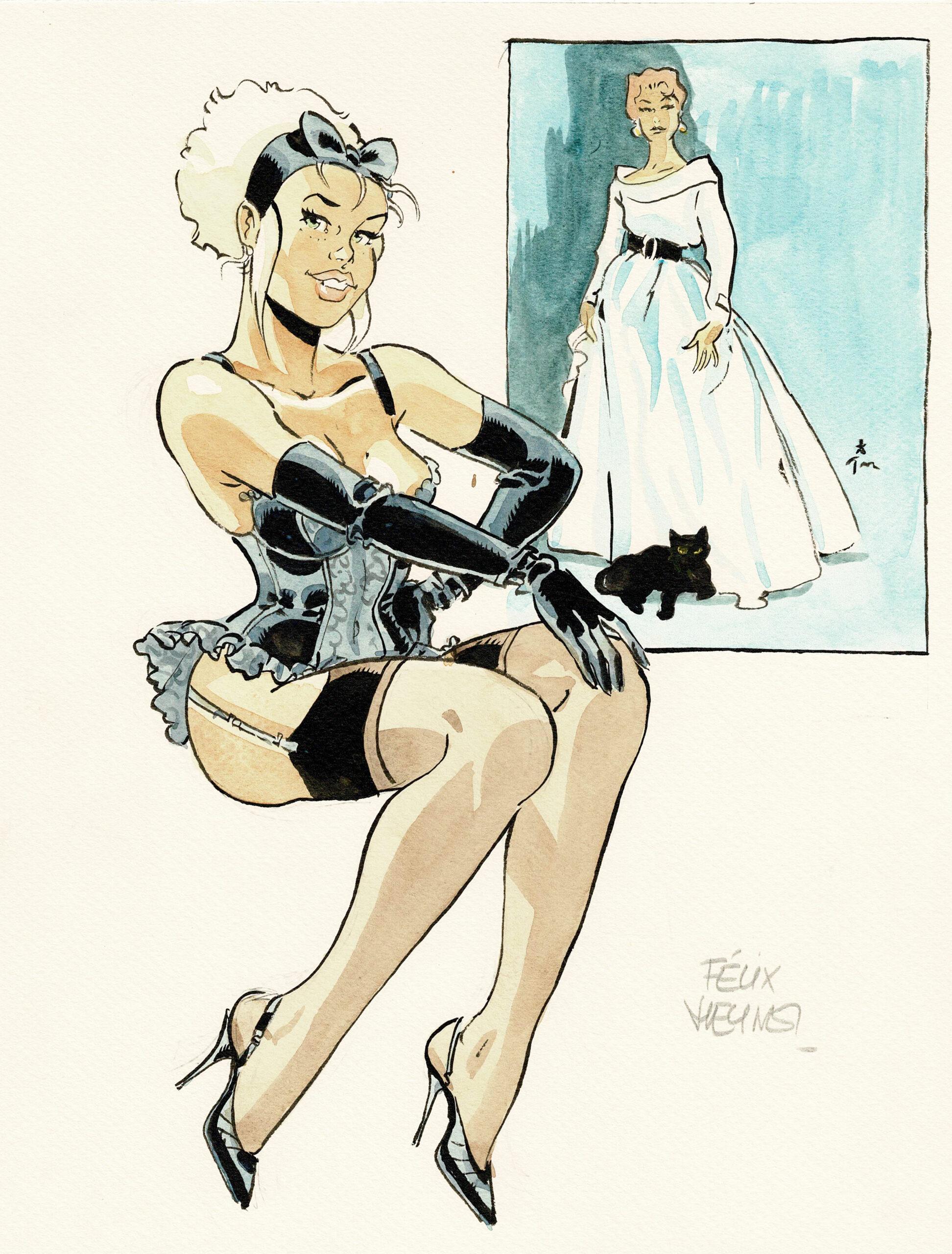 Mirabelle, dessin original à l’encre de chine et à l’aquarelle en hommage à René Gruau. Dimensions : 32 cm x 24 cm.