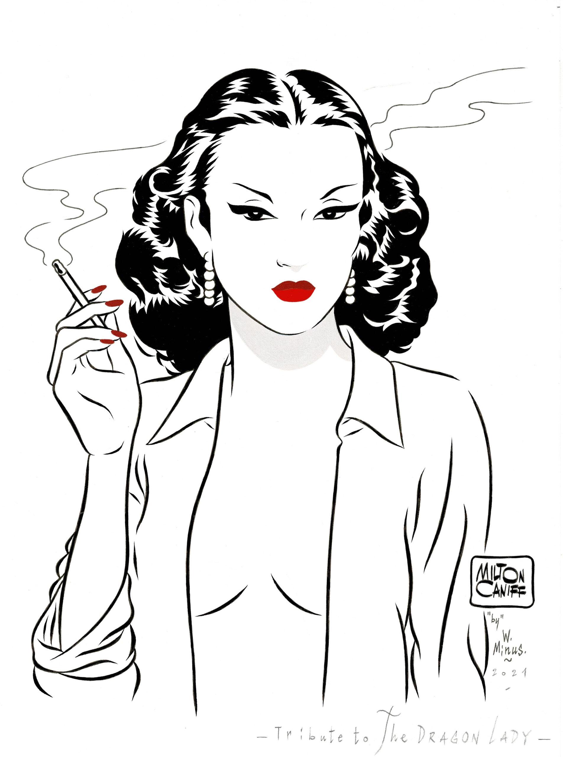 The Dragon Lady, dessin original à l’encre de chine, au lavis et aux encres de couleurs en hommage à Milton Caniff. Dimensions : 29,5 cm x 21 cm.
