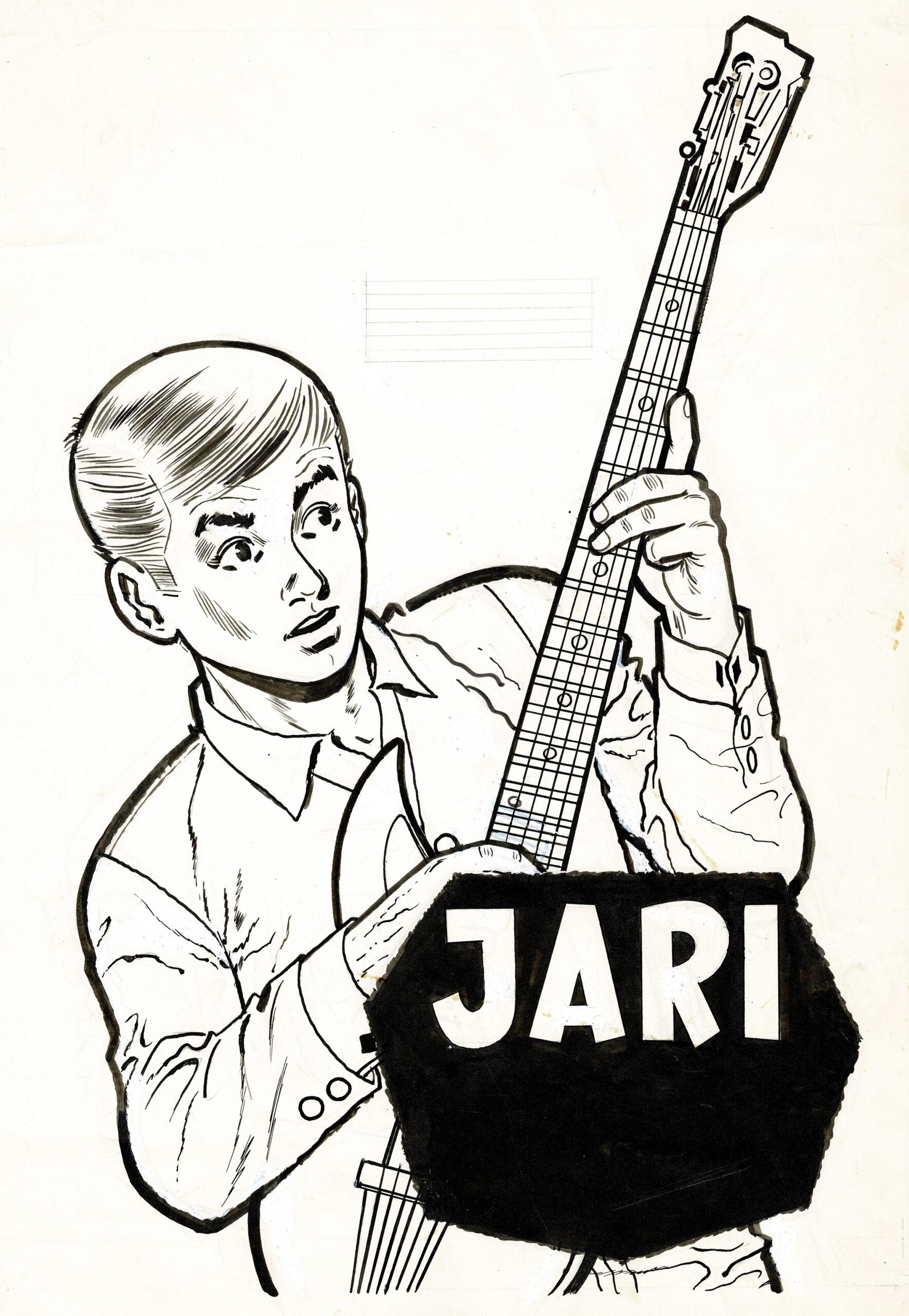 Jari, Guitare et Dynamite, couverture originale à l’encre de chine pour le journal Tintin n° 864 du 13 mai 1965. Dimensions : 41,5 cm x 30,5 cm.