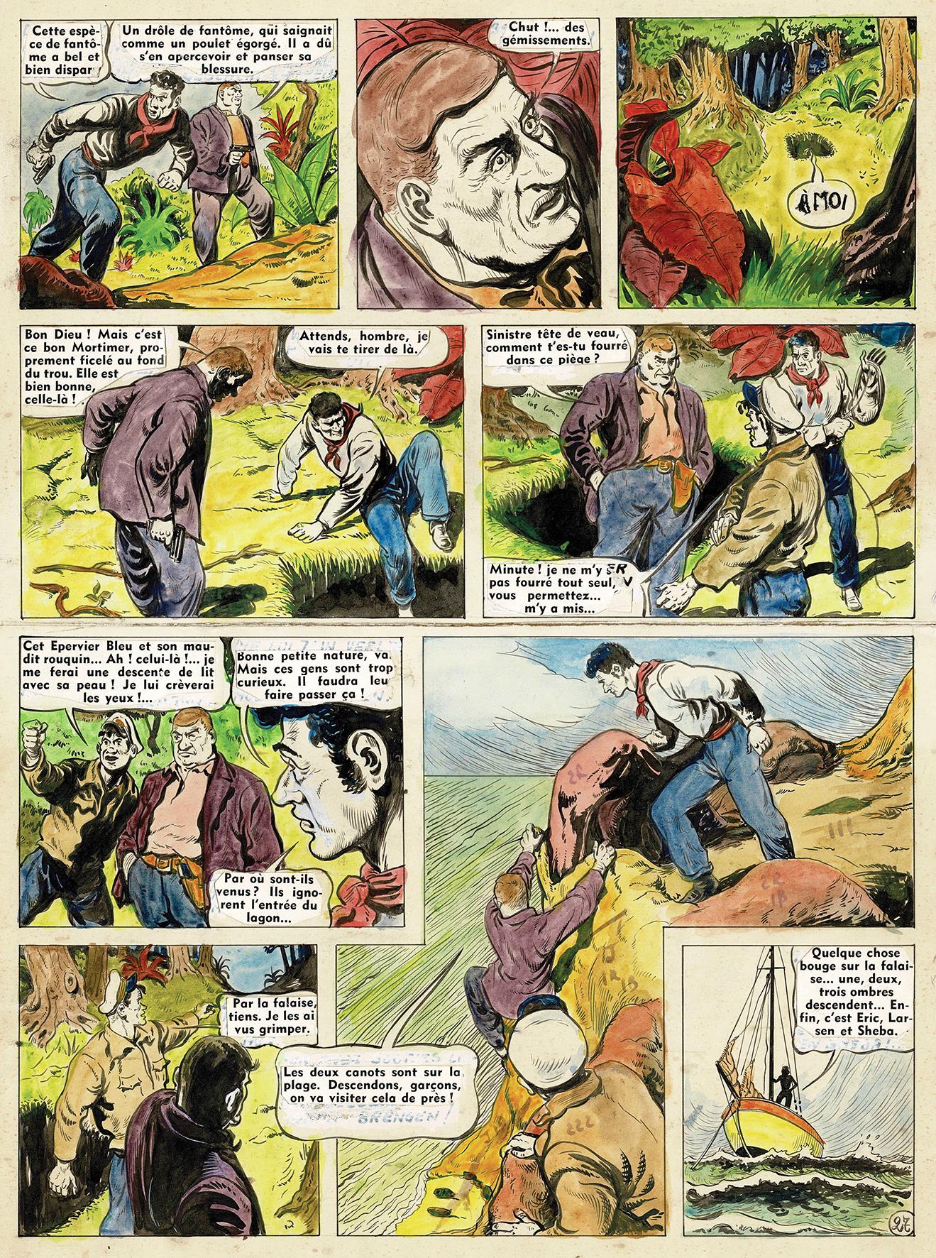 L’Epervier Bleu Tome 1, planche originale à l’encre de chine et à l’aquarelle. Dimensions : 46 cm x 32 cm.