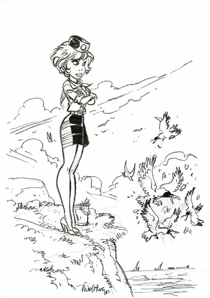Natacha, dessin original à l’encre de chine, cachet de Walthéry au verso. Dimensions : 42 cm x 29,5 cm.