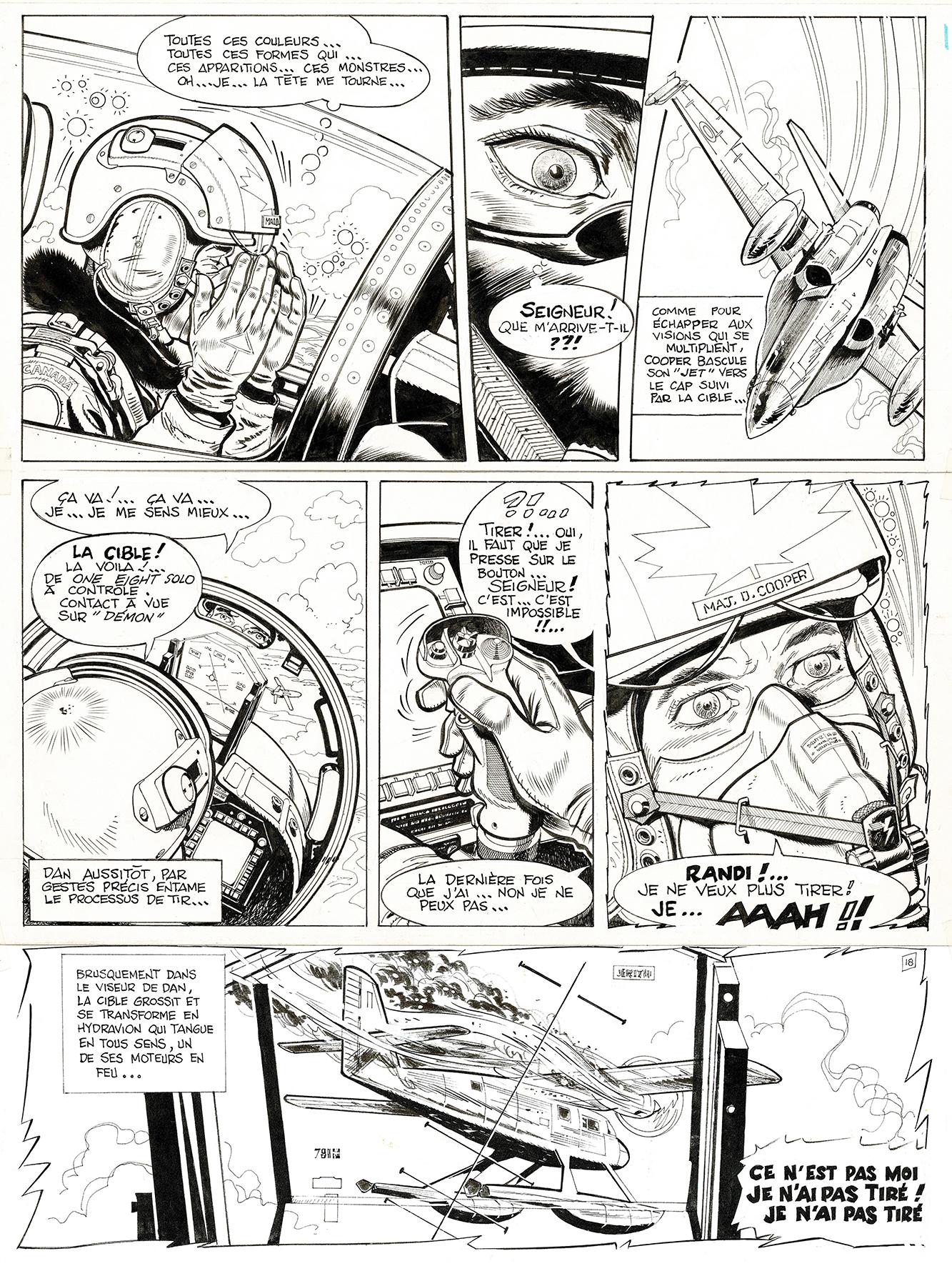 Dan Cooper, Target, planche originale à l’encre de chine pour cet album paru en 1985 chez Novedi. Dimensions : 48 cm x 35 cm.