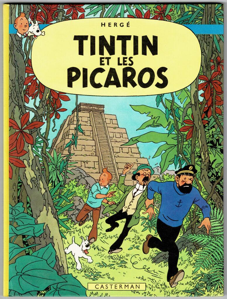 Tintin et les Picaros, édition originale de 1976 (C1, 24 traductions) avec la planche autocollante 22 bis. Etat neuf.