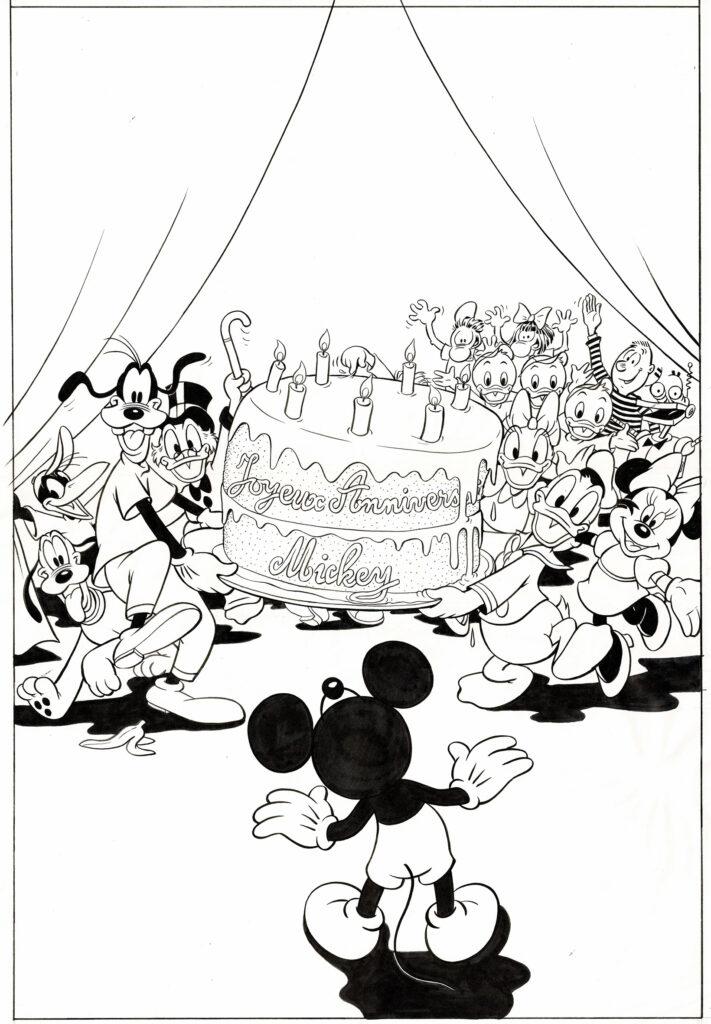 Joyeux anniversaire Mickey, dessin original grand format à l’encre de chine. Dimensions : 44,5 cm x 32 cm.