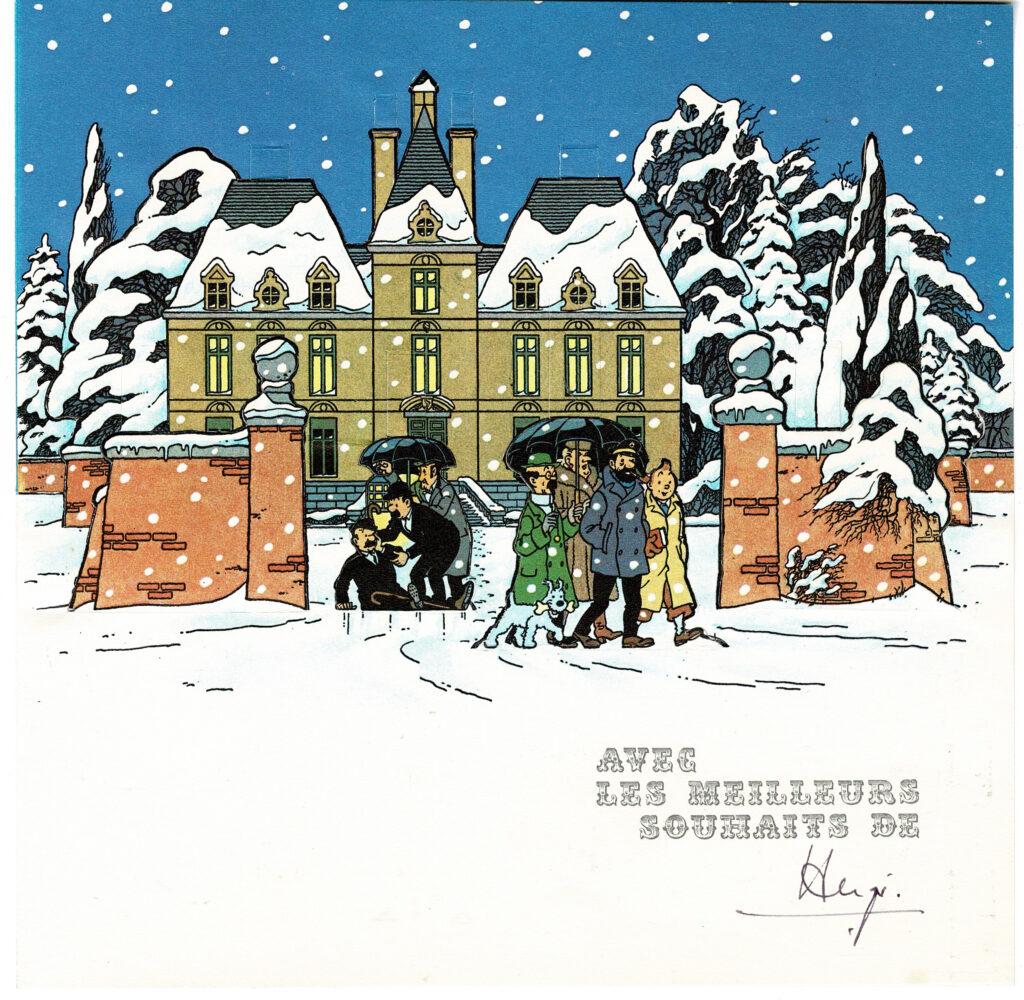 Tintin, carte de voeux de 1966 : Tintin et ses amis sortent de Moulinsart pour se rendre à la messe de minuit, signée.