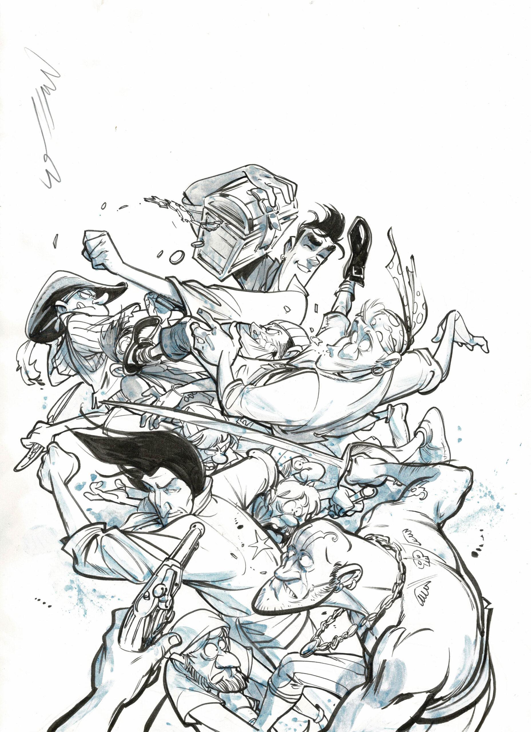 Les Campbell, dessin original à l’encre de chine et au lavis réalisé pour un ex-libris. Dimensions : 42 cm x 29,5 cm.