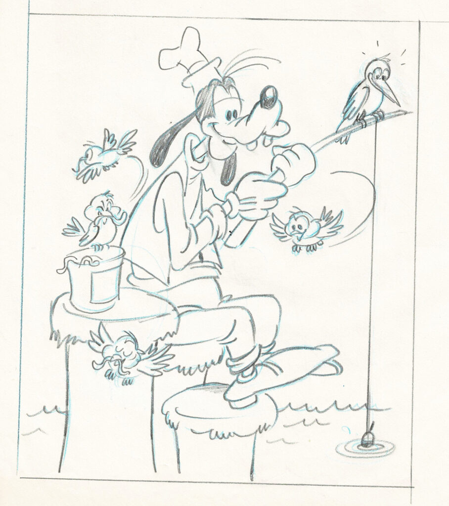 Dingo à la pêche, Projet de couverture original à la mine de plomb. Dimensions : 33 cm x 25 cm.