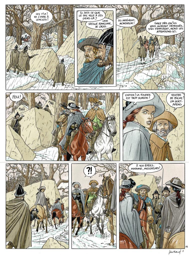 Les 7 Vies de l’Epervier, Quinze ans après, planche originale à l’encre de chine et aux encres de couleurs pour cet album paru en 2014 chez Dargaud. Cette planche a fait l’objet d’une étude sur sa conception dans le tirage de tête de cet album. On peut également remarquer la construction surprenante et innovante du premier strip de cette planche. Dimensions : 48 cm x 36 cm.