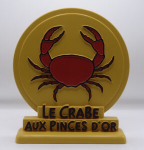 [ Estimation 400 – 500 ] PIXI REGOUT : Tintin, la stèle ou bas-relief, Le Crabe aux pinces d’or, plâtre, 1991, 35 cm. Rare.